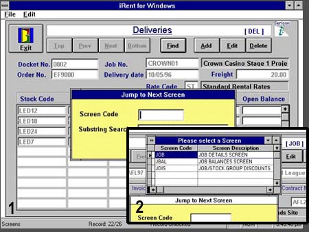 Ease of Use Features IntelliMenu Scaftech's experience with developing systems has identified that most users use only a small number of screens on a daily basis, depending on their job function. Scaftech's proprietary IntelliMenu system provides the user with the ability to customize the main menu so that his/her most frequently used functions are always displayed on the main menu. This provides an easy push button facility for each user to access his/her most frequently used screens. IntelliSwitch Traditional menu systems consist of a menu hierarchy with a labyrythmic series of menus and sub menus requiring the user to navigate up and down menus to find the one the screen they want. Scaftech incorporates into all it's software proprietary IntelliSwitch technology, which allows a user to switch from any screen to any other screen by simply pressing a function key. Each screen and report in the system has a unique ID, which identifies which function to switch to. For iRent, typical screen Id's include : Job Balances = "JBAL" Deliveries = "DEL" Returns = "RET" In the below example, from any screen, the user can switch to the Deliveries screen by pressing function key 12, followed by "DEL". ![]() Furthermore, if the user wants to switch but cannot remember the ID, typing a "?" will bring up a keyword text search function which will allow the user to specify a keyword to find the screen e.g. if you want to switch to the program status report but cannot remember the ID, enter the word "status" and a pick list appears listing all the screens/reports that have that keyword in their description. The old style menu hierarchy is still available for users that prefer a more traditional method, although our experience has been that users quickly learn the most frequently used Ids and tend to use Screen Switching most of the time, if not exclusively. Auto Lookups Scaftech incorporates into all its software Automatic Lookup Lists on all screens, which require a code. The lookup screen can be called by the user or if the user enters a wrong code, the lookup screen appears automatically. ![]() The benefit of this feature is that users do not ever need to remember codes. User defined Filters Scaftech incorporates into all its software User Defined Filters on all screens. The filter allows the user to search for records according to special conditions e.g. I want to view all jobs that have over 2000 boards on site. ![]() The benefit of this feature is that users have powerful query facilities to view the data records they need in different situations.
